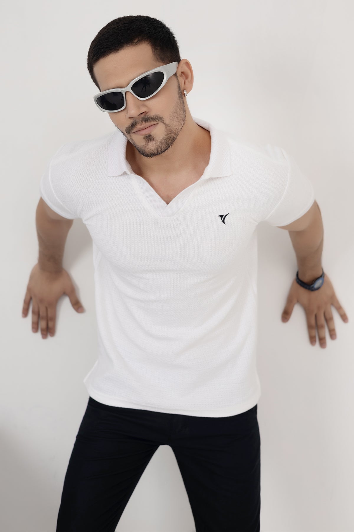 Elevated minimalism. This white jacquard knit polo features a refined texture and a subtle sheen that stands out quietly. The open V-placket and soft collar give it a relaxed yet polished feel, while the embroidered Outlaw logo in black adds a crisp contrast. It’s breathable, lightweight, and effortlessly sharp.